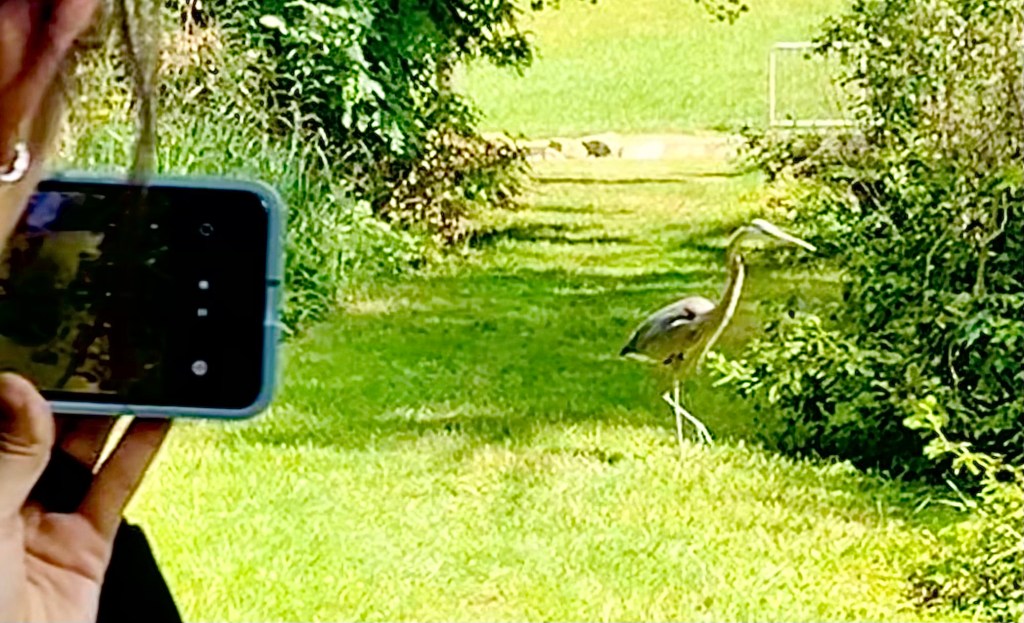 There was a stream filled with ducks. Among them was a tall gray-blue bird standing motionlessly. We walked down alongside the bank to get a closer look, but when we got there, it was gone. We went up to the other side of the stream and kept walking. Suddenly we found it far up on the bank quietly looking into the water, probably trying to catch a fish. A moment of awe.
